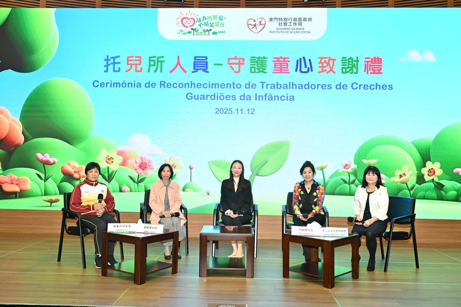 致谢礼上除了致送感谢状,亦播放了一段向托儿所人员致敬的短片,多名托儿所资深人员在短片中分享工作点滴和感受,亦记录了他们在日常工作中与幼儿互动的温馨倩影。此外,致谢礼邀请到澳门仁慈堂托儿所所长马韶漪、妇联第三托儿所主任黄群洁、母亲会圣约翰托儿所(凼仔)幼儿导师助理李倩娴和工联望厦托儿所保育员杨丽珍,现场分享多年来在各自工作岗位上的心路歷程和温馨故事。他们均表示,虽然托儿工作充满挑战,但每一次与幼儿的互动、每一个成长的见证,都是最珍贵的回报。他们亦寄语年轻同工要秉持初心,坚守专业精神,继续以爱心和耐心陪伴幼儿成长。