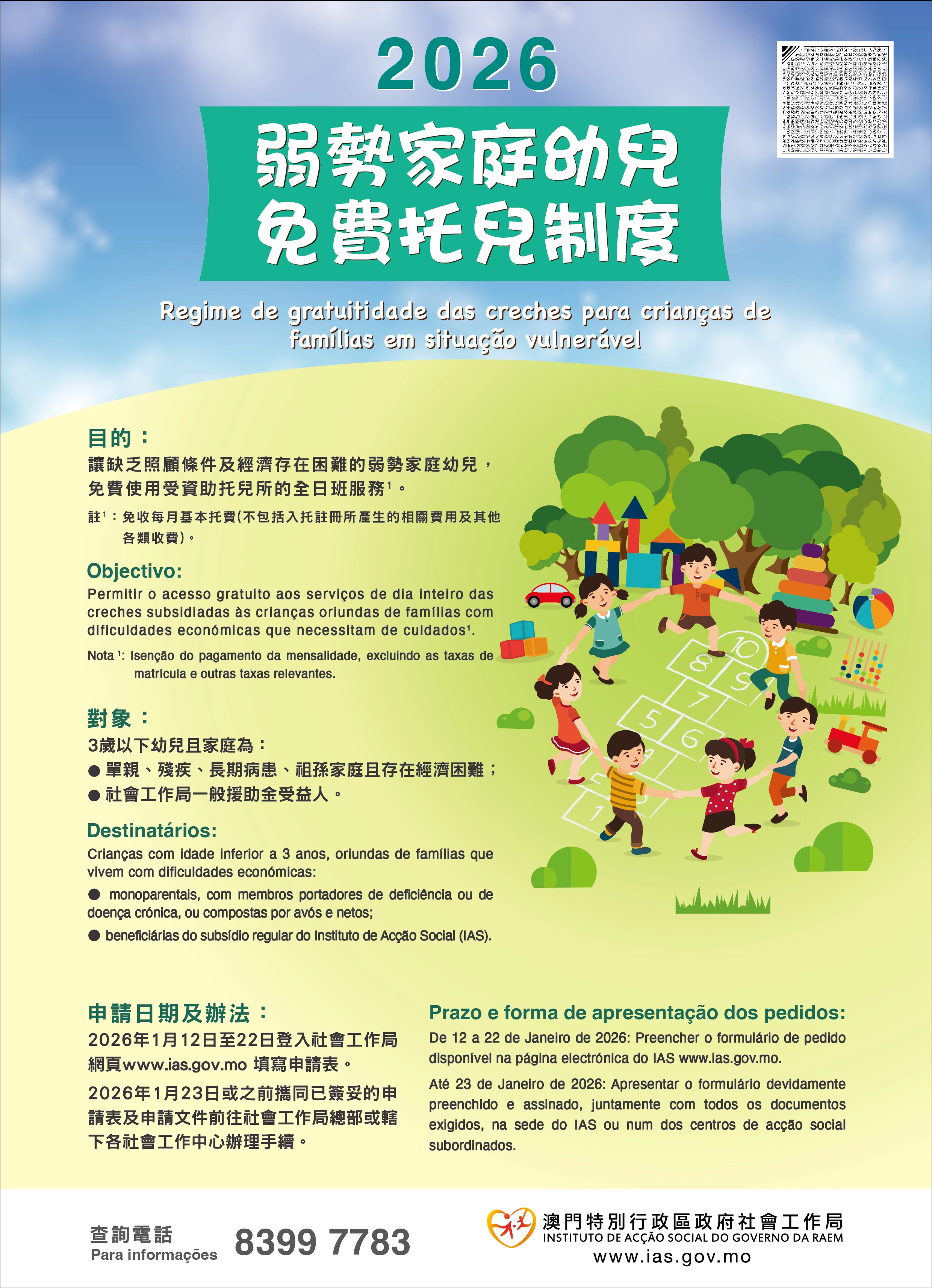 社会工作局协调30多间受资助托儿所推出「弱势家庭幼儿免费托儿制度」,期望为缺乏照顾条件及经济存在困难的弱势家庭幼儿,提供申请免费使用受资助托儿所服务,於2026年1月12日起接受申请。